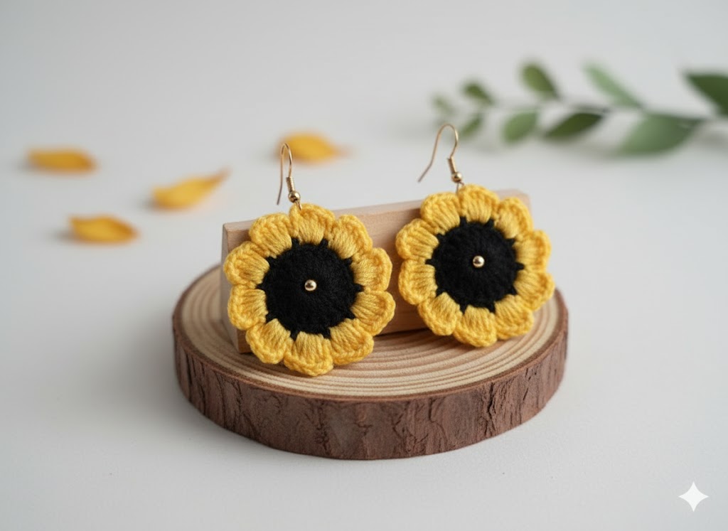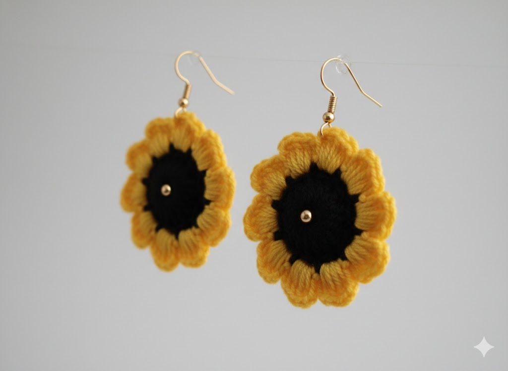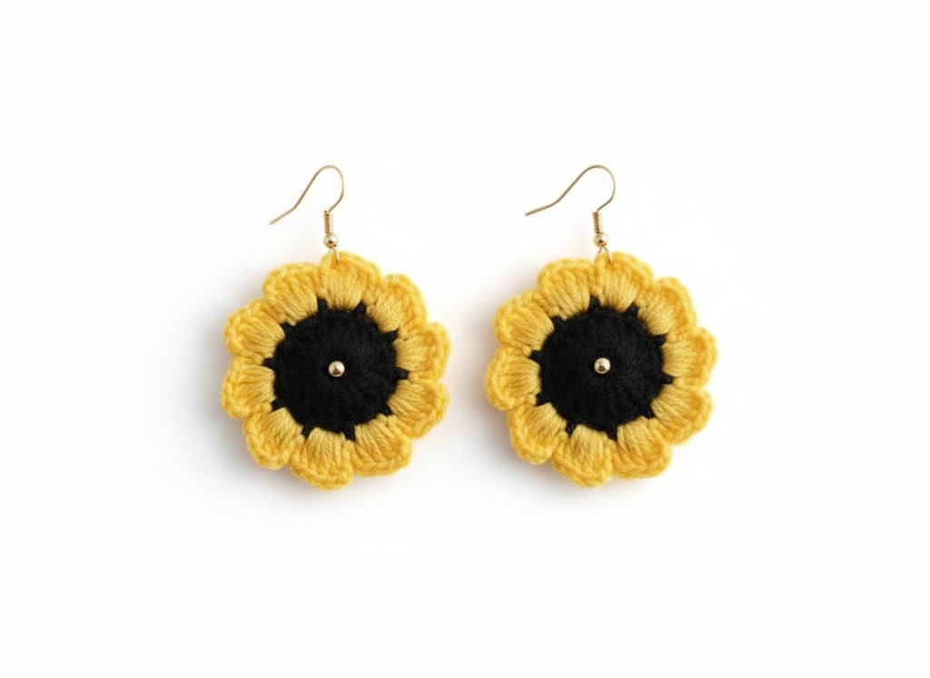 Estos aretes son una pieza de joyería textil que combina tradición y diseño contemporáneo. Cada pétalo amarillo está tejido con precisión alrededor de un centro negro profundo, creando un contraste dinámico que resalta cualquier atuendo.
