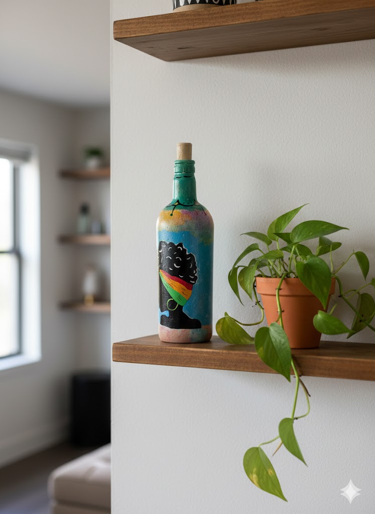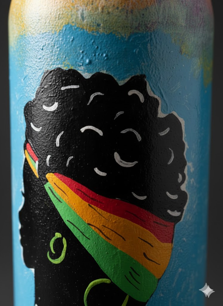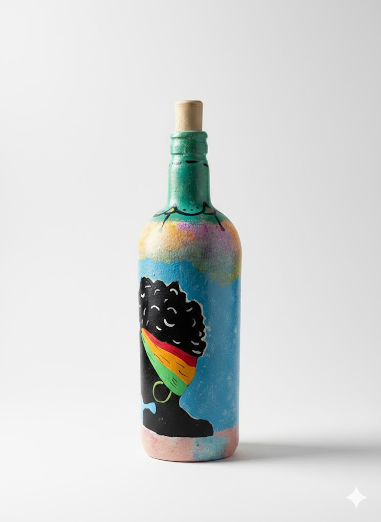 Esta botella no es solo un objeto decorativo, es una expresión de identidad y creatividad. Presenta la silueta de una mujer con un turbante multicolor en tonos amarillo, verde y rojo, resaltando sobre un fondo azul cielo texturizado que evoca frescura y alegría.