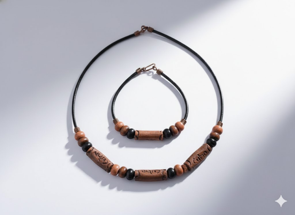 El set «Raíces» es una pieza de diseño que celebra la artesanía tradicional. Cada conjunto incluye un collar y una pulsera coordinados, fabricados sobre una base de cordón de cuero negro de alta calidad.