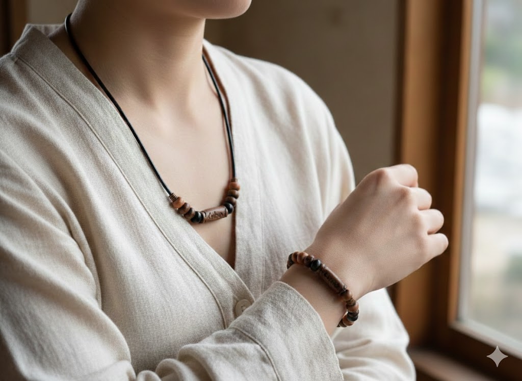 El diseño destaca por sus cilindros de madera central tallados a mano con motivos que evocan simbología antigua, acompañados de cuentas esféricas en tonos madera natural y negro mate. Su estética monocromática con acentos orgánicos lo hace extremadamente versátil, ideal tanto para un look casual diario como para un estilo festivalero más elaborado.