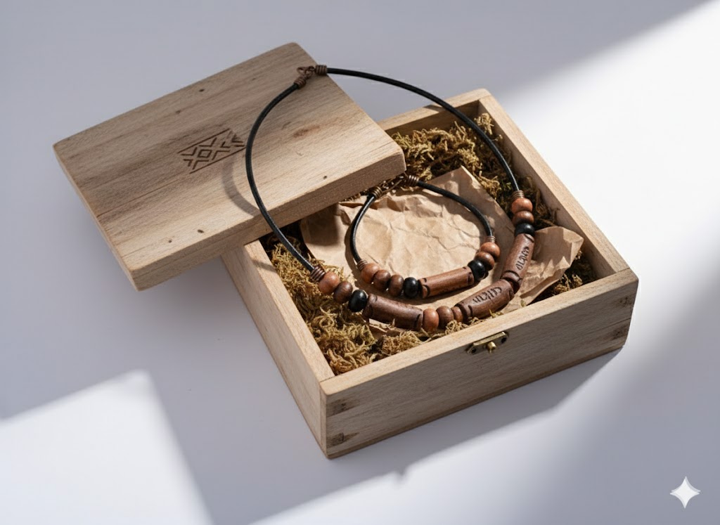 | Materiales | Madera natural, cuentas de resina mate y cordón de cuero. |