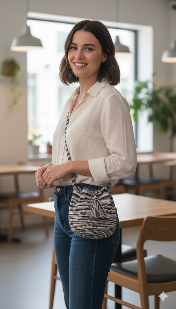 Cuenta con una gaza (correa) ancha que garantiza comodidad al llevarla cruzada o al hombro, y un sistema de cierre mediante cordón ajustable rematado con borlas artesanales que le dan un toque auténtico y dinámico.
