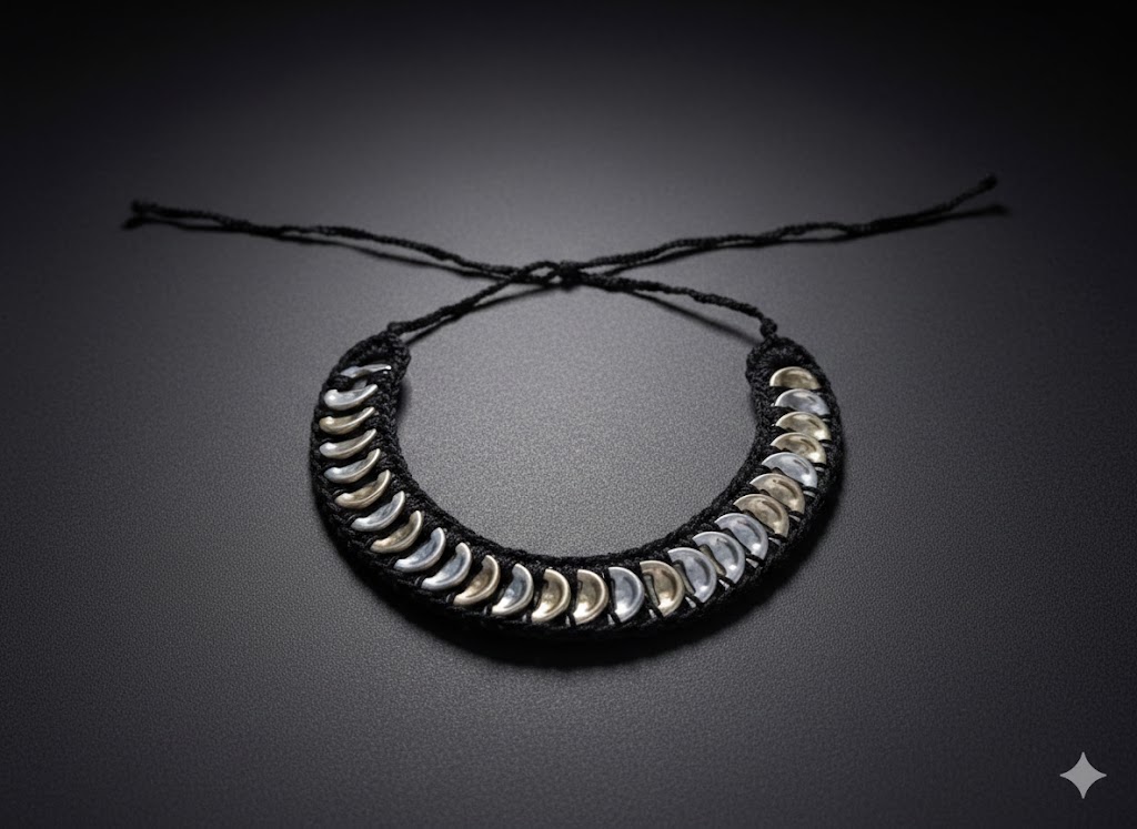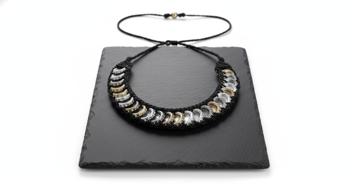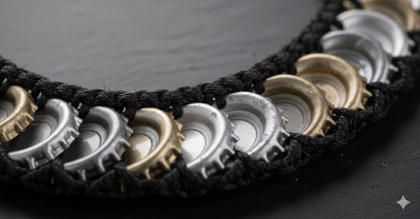 Este collar no es solo un accesorio, es una declaración de principios. Creado bajo el concepto de moda circular, utiliza tapas de metal cuidadosamente transformadas e integradas en una base de tejido técnico negro de alta resistencia.