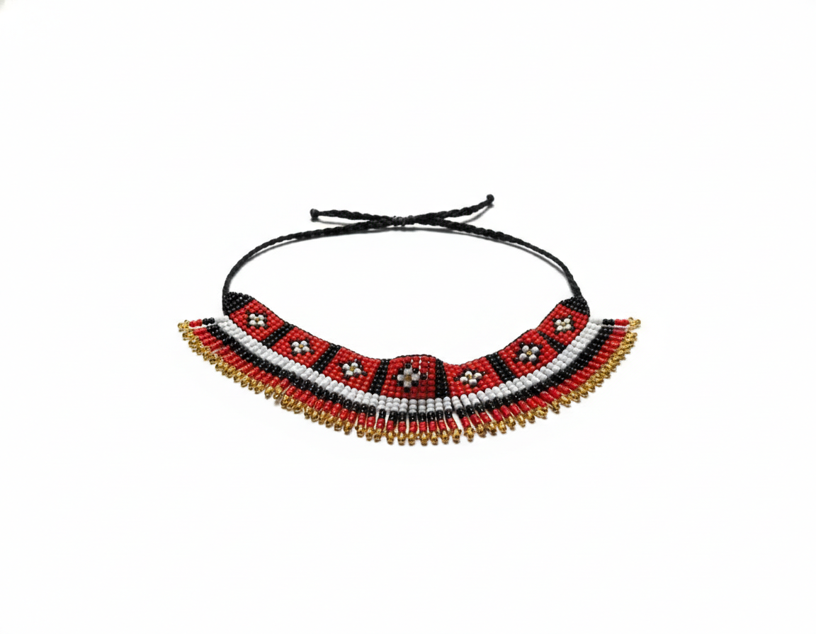 Lleva contigo el arte y la tradición en cada paso. Esta tobillera ha sido meticulosamente elaborada por manos artesanas utilizando chaquiras de alta calidad, dispuestas en un patrón de mosaico que alterna flores estilizadas y franjas horizontales.