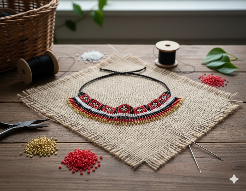| Materiales | Chaquiras de cristal, hilo de alta resistencia y cordón sintético. |